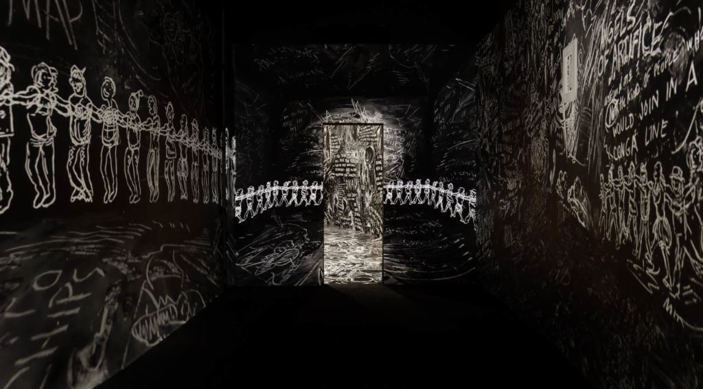 White writing scatters over the stark black walls as Anderson forces you to consider many things, from “who owns the moon” to “where did all the wizards go?” Sharks leap in waves, rabbits row boats with rats, and birds speak in this room, as the specter of technology looms over the space. The exhibition’s title also jumps out here, with a quote from composer and like-minded artist John Cage scrawled on the wall: “Less like an object and more like the weather.”