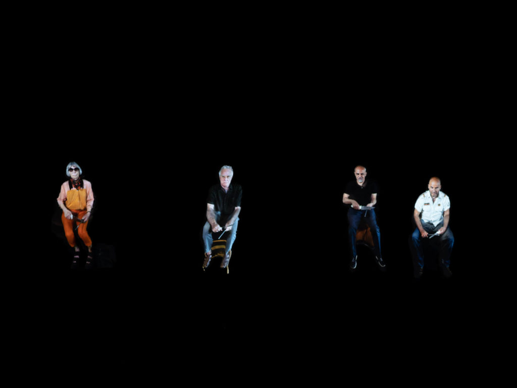 Wrapping around to “Citizens,” this 2021 piece greets you with the sound of knives sharpening. Small, slightly ludicrous clay figures with looping video projections on top scrape against honing steel. It’s odd, and off-putting. Anderson is playing with scale here, with nearly 20 figures lined up, facing you, shrunken and seated.