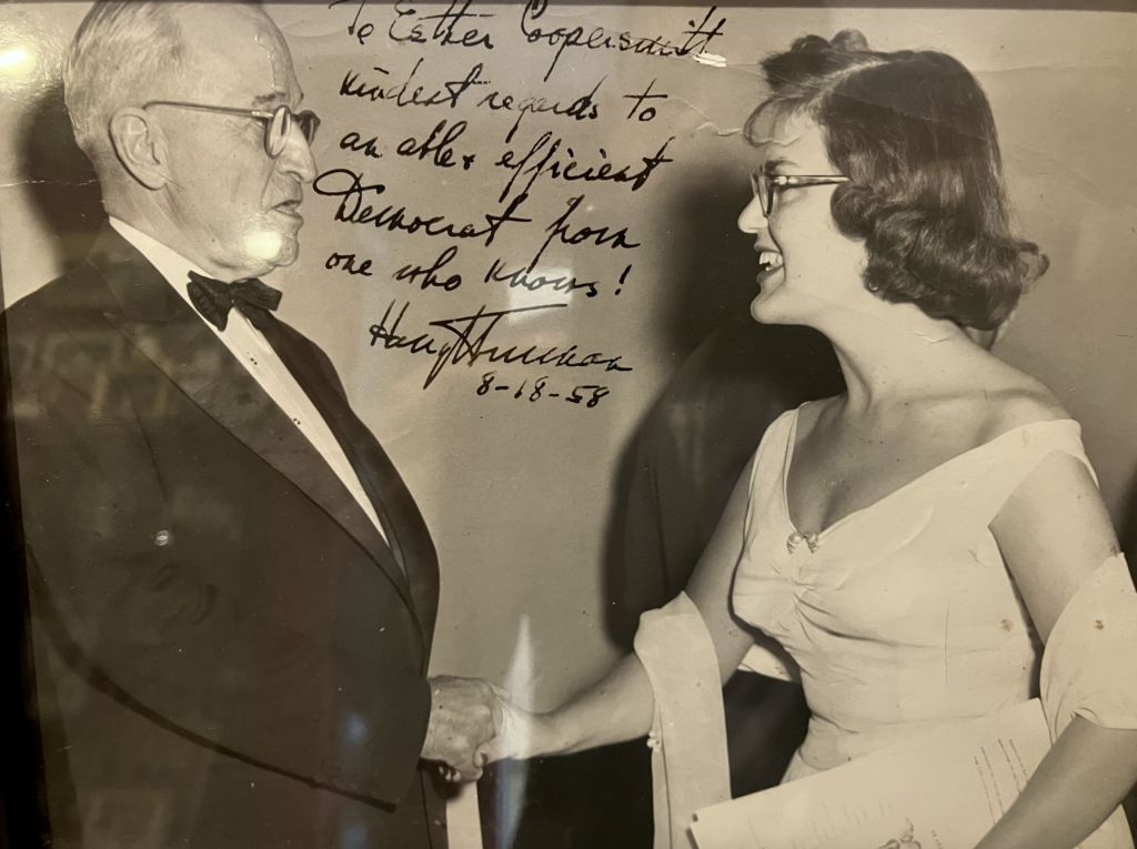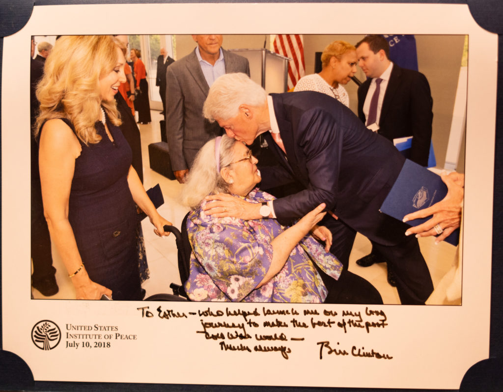 Along the way, she has managed to fill every available space of a large downstairs red room with memorabilia, including this framed letter dated April 19, 2010, from President Clinton, which says, in part: “I have known Esther for a very long time, and I have always been impressed by her firm commitment to public service. She has devoted her entire career to strengthening our nation, and we owe a great debt to leaders who serve with the kind of devotion and compassion that Esther has demonstrated in her work. She has been a fixture in our country’s political life, and has championed peace and intercultural understanding throughout her career.”