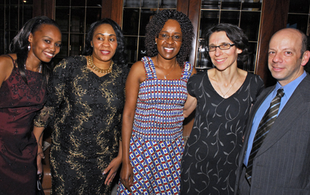 From left, Embassy of Kenya officials Sheila Muthemba, Joy Gacuga and Lucy Kiruthu, along with Susan Driano, Kenya desk officer at the State Department, and Driano’s husband, Brian Poochigian, attend the Kenyan Embassy’s inaugural celebration for President Obama.