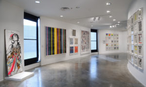 The explosive use of color in play by many of the artists is a notable aspect of the exhibition, with pieces jumping out vibrantly from the stark white walls.