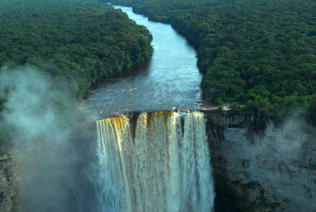 Panoramic aerial view of Guyana’s majestic Kaieteur Falls, which at 226 meters high is the world’s largest single-drop waterfall. (Photo by Larry Luxner)