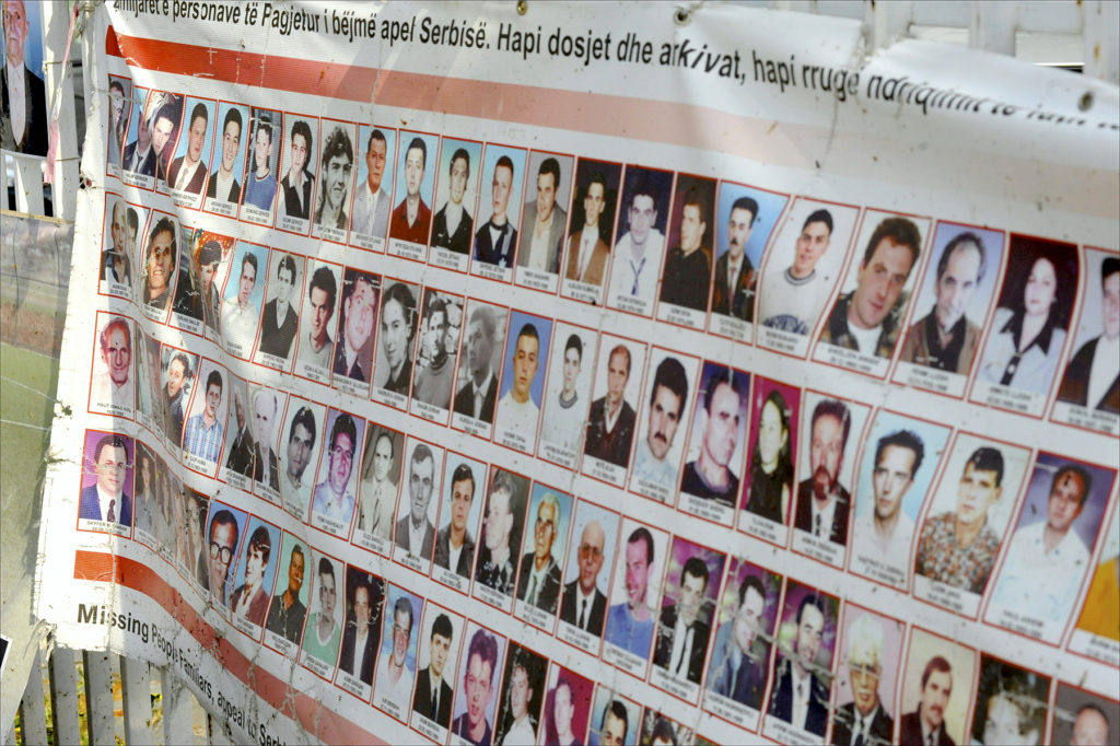 A banner next to Kosovo’s Parliament building in Prishtinë calls on Serbian authorities to open the sealed archives on the fate of Kosovars who disappeared during the ethnic cleansing campaign of the late 1990s. (Photo by Larry Luxner)