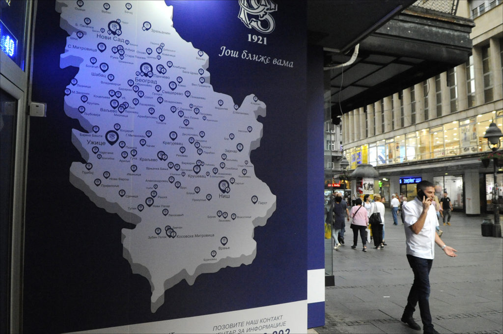 Advertisement along a pedestrian shopping street in Belgrade shows a map of Serbia that includes its former autonomous province of Kosovo — which declared independence in 2008 — as part of the Serbian nation. (Photo by Larry Luxner)