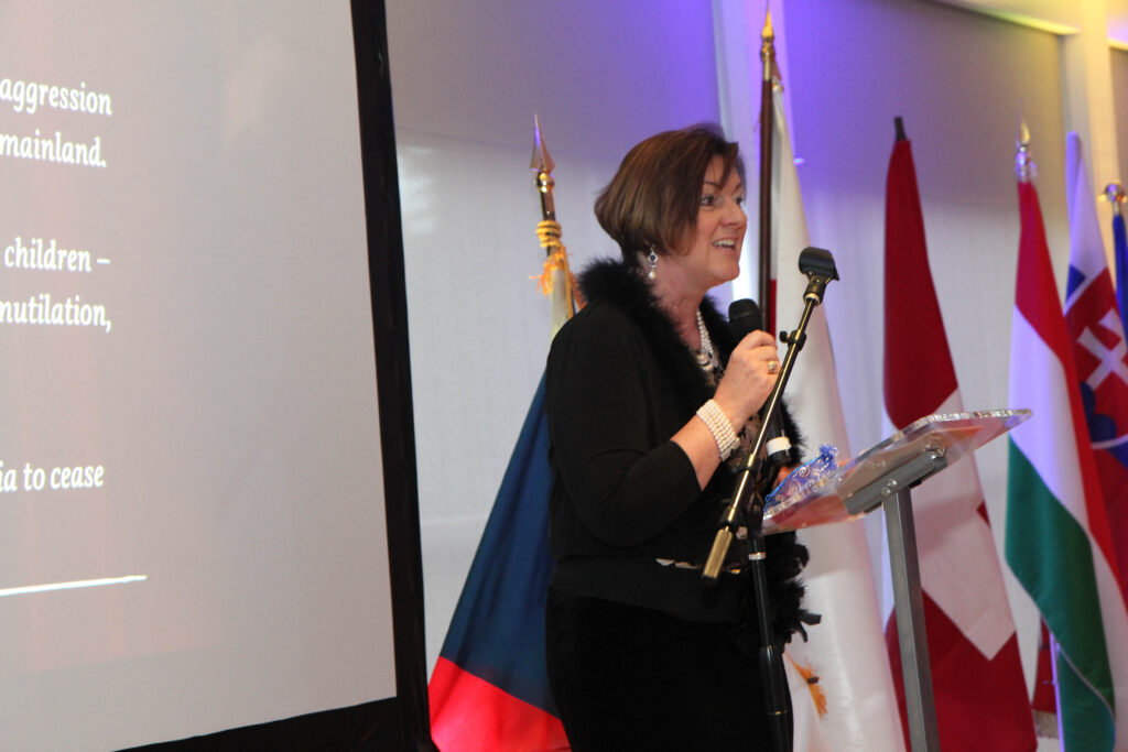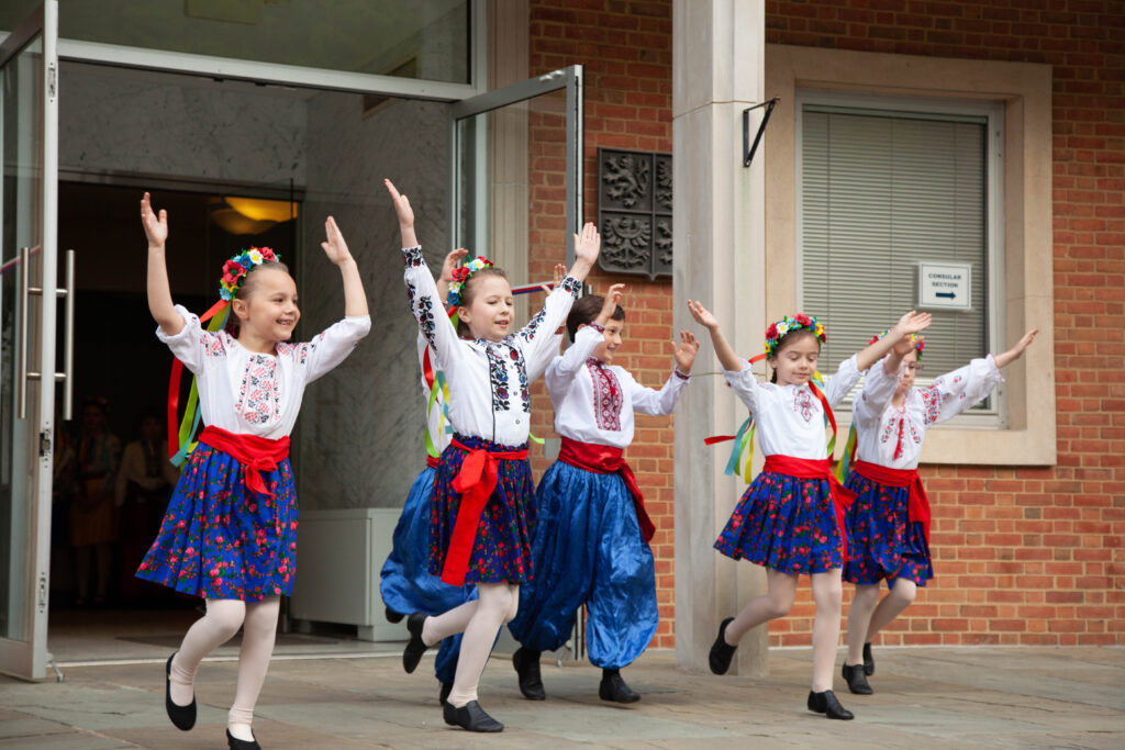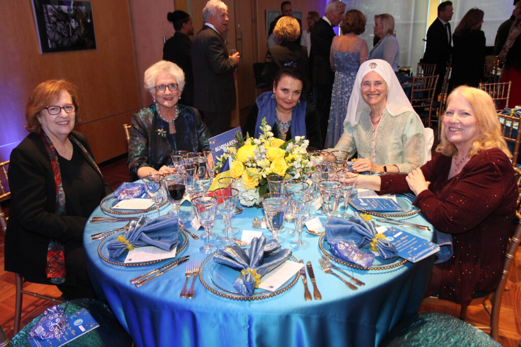 The children performed Ukrainian dances before the guests entered the dining room, where tables were decorated in the yellow and blue of Ukraine’s flag and identified by the name of the capital of the country whose ambassador was at the table.