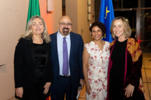 Guests enjoyed a wide selection of drinks—including a Prosecco wine station—a buffet dinner, and dancing with an opportunity to explore the culture the embassy offers. Banners and signs decorated the tables featuring women from around the world who’ve demonstrated outstanding bravery in their reporting. Elisa Lees Muñoz, executive director of the International Women’s Media Foundation, introduced their 2020 Courage in Journalism award winner Solafa Magdy.