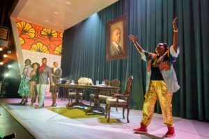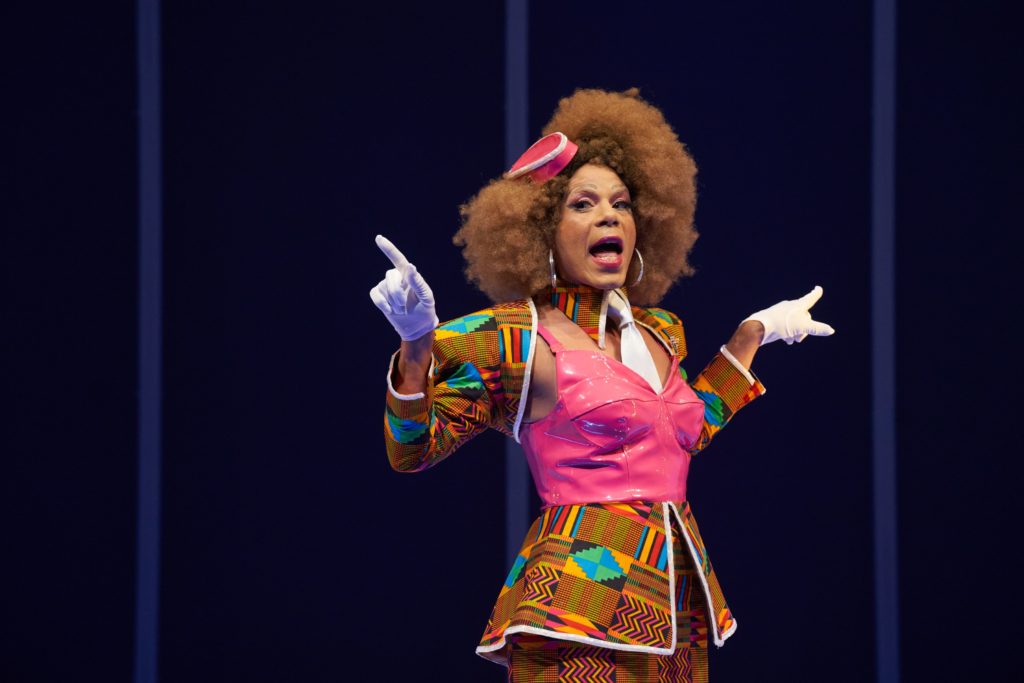 The narrator, an over-the-top Black drag queen named Peaches, played expertly by Jon Hudson Odom, is dressed to kill by costume designer Yvonne Miranda, who is also the airline attendant for African-American Airlines flight 1619, the last flight to Africa. (The flight number is a nod to the 1619 Project– an endeavor to reframe the country’s history by placing the consequences of slavery and the contributions of Black Americans at the center of the United States national narrative.)